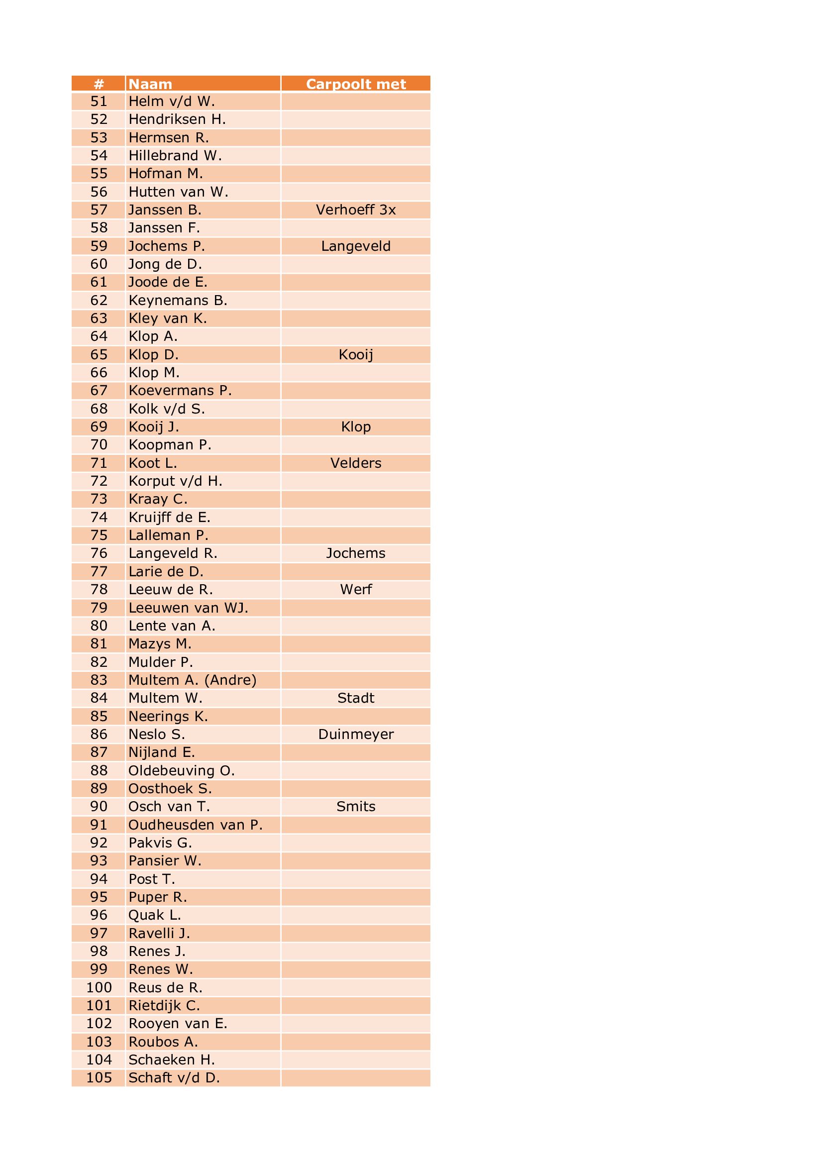 De deelnemerslijst voor de aankomende 4-Daagse is rond en we willen iedereen vragen om te controleren of hij juist is vermeld op de lijst. We vragen extra aandacht voor de deelnemers die carpoolen. Dit om er zeker van te zijn dat we dit goed kunnen inregelen voor het loten.